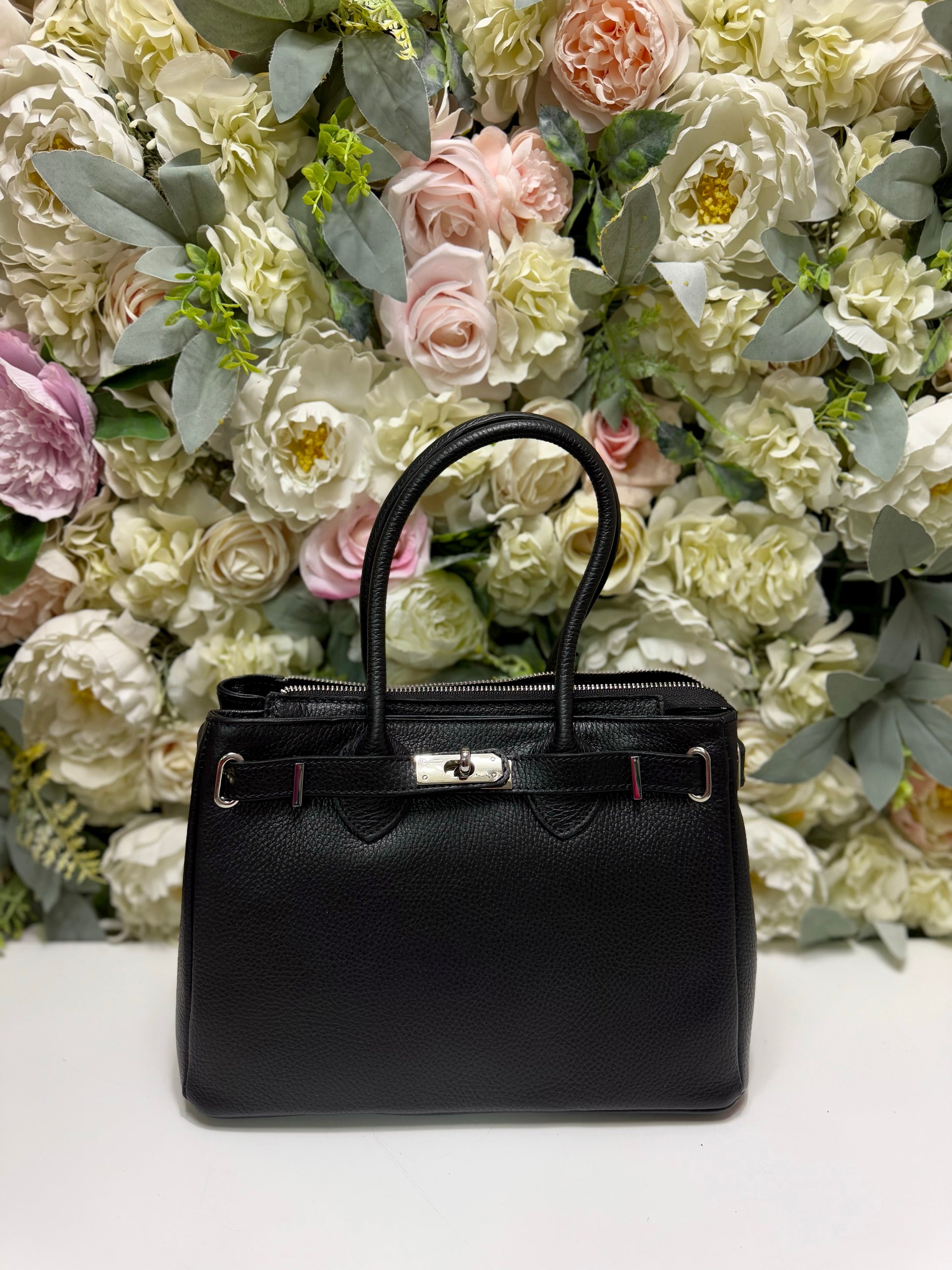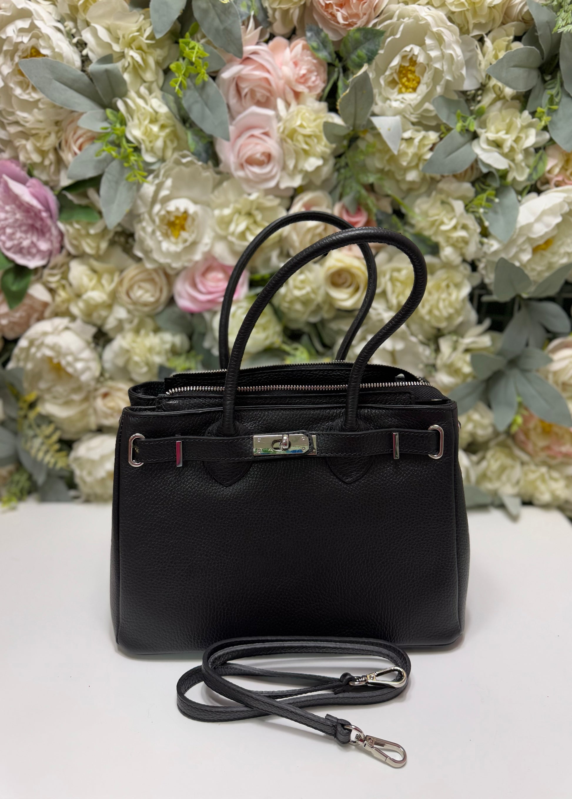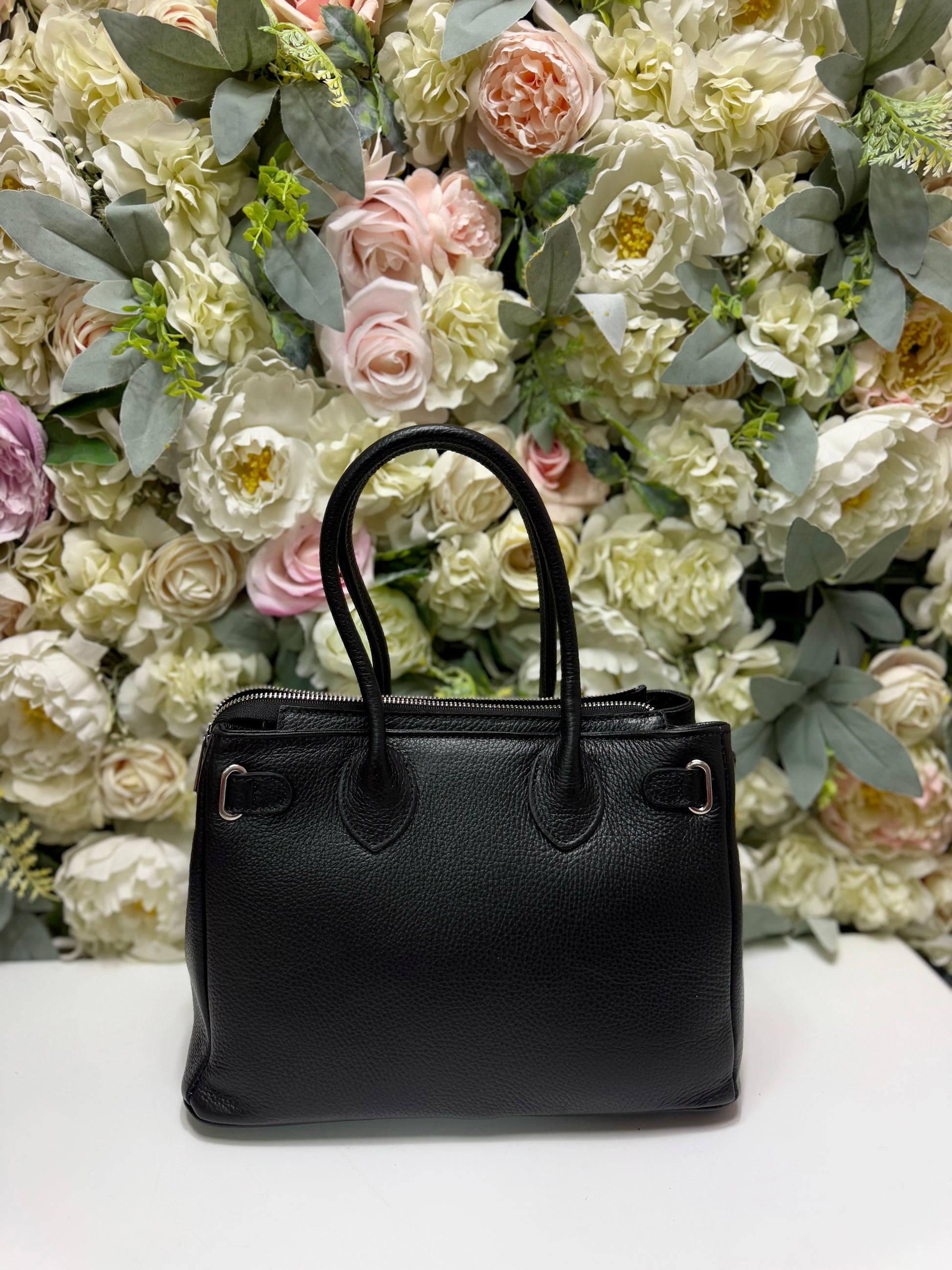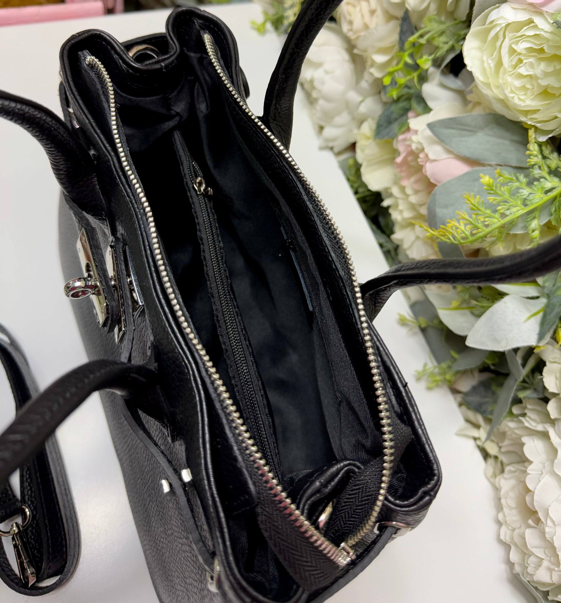 Geanta realizată din piele naturală premium. Dispune de două compartimente spațioase, separate de un buzunar central cu fermoar și însoțite de încă unul mic interior, ideale pentru organizarea obiectelor esențiale. Închiderea cu fermoar asigură siguranță, iar designul versatil îți permite să o porți atât în mână, cât și pe umăr sau crossbody, datorită baretei reglabile.