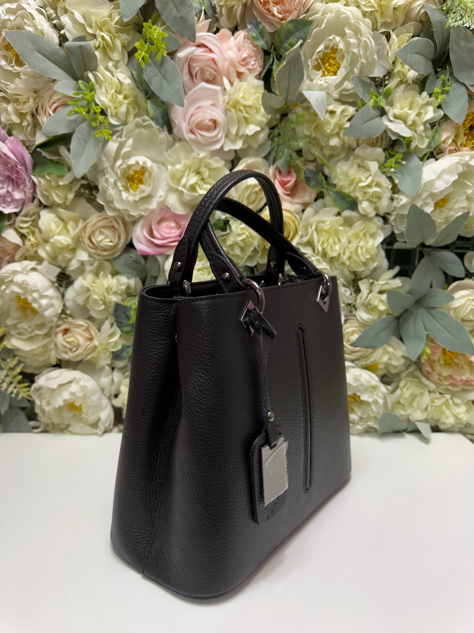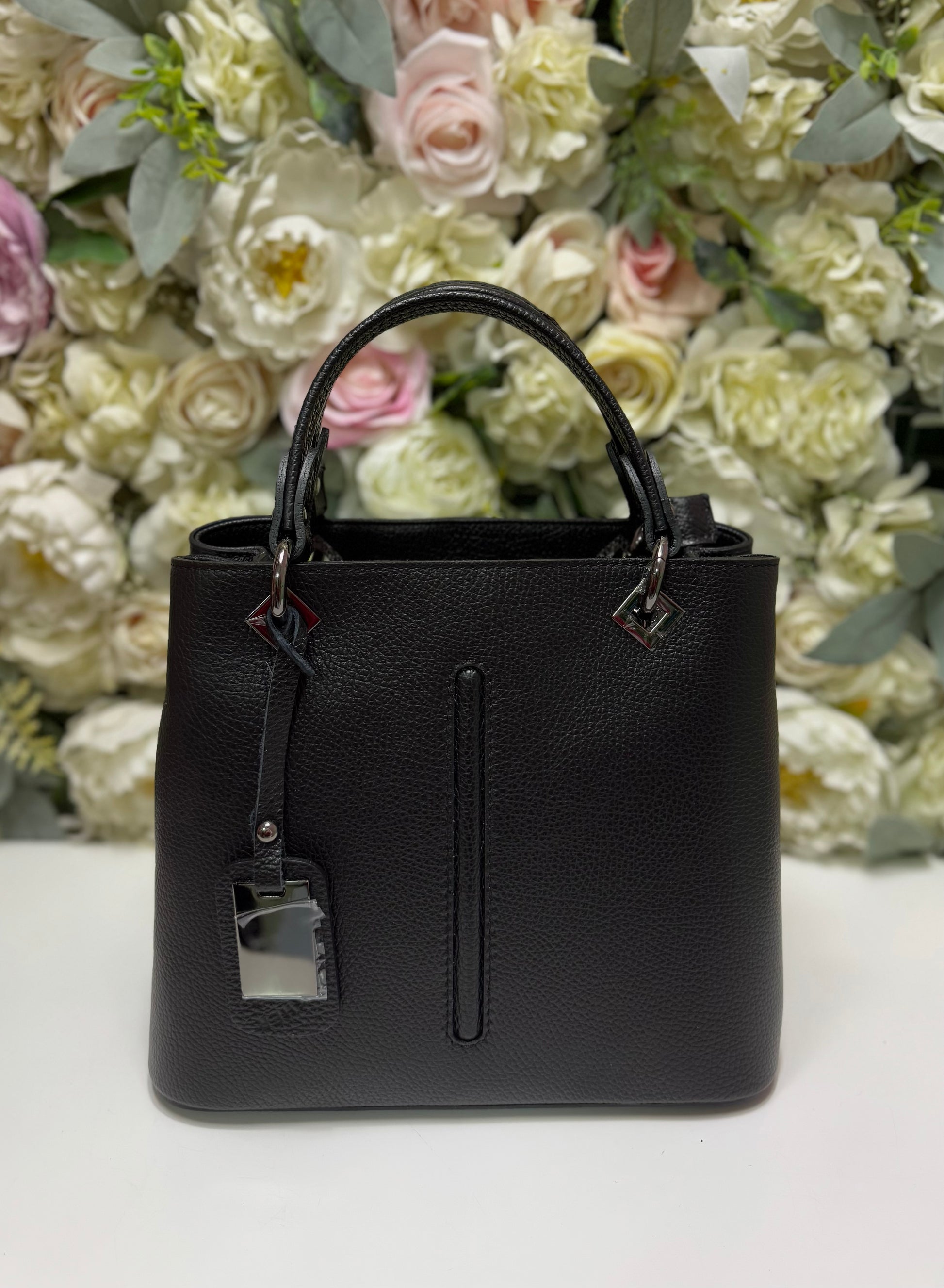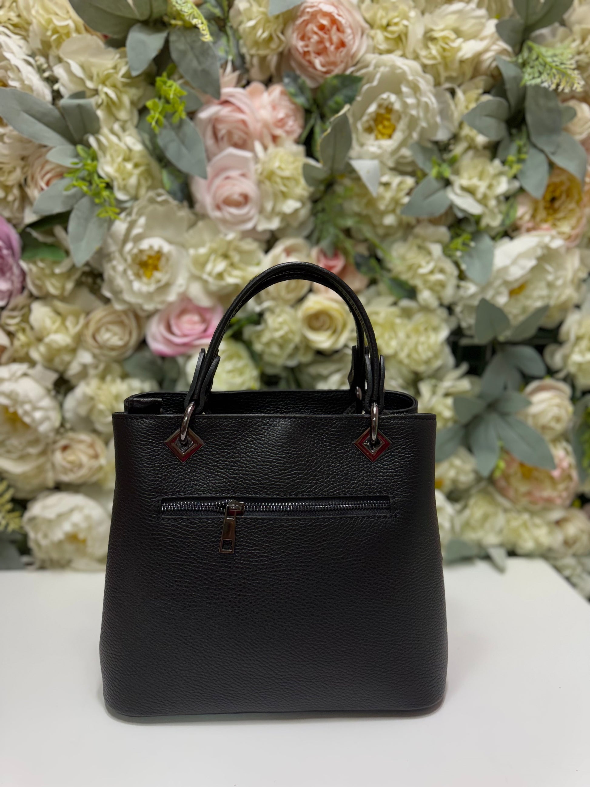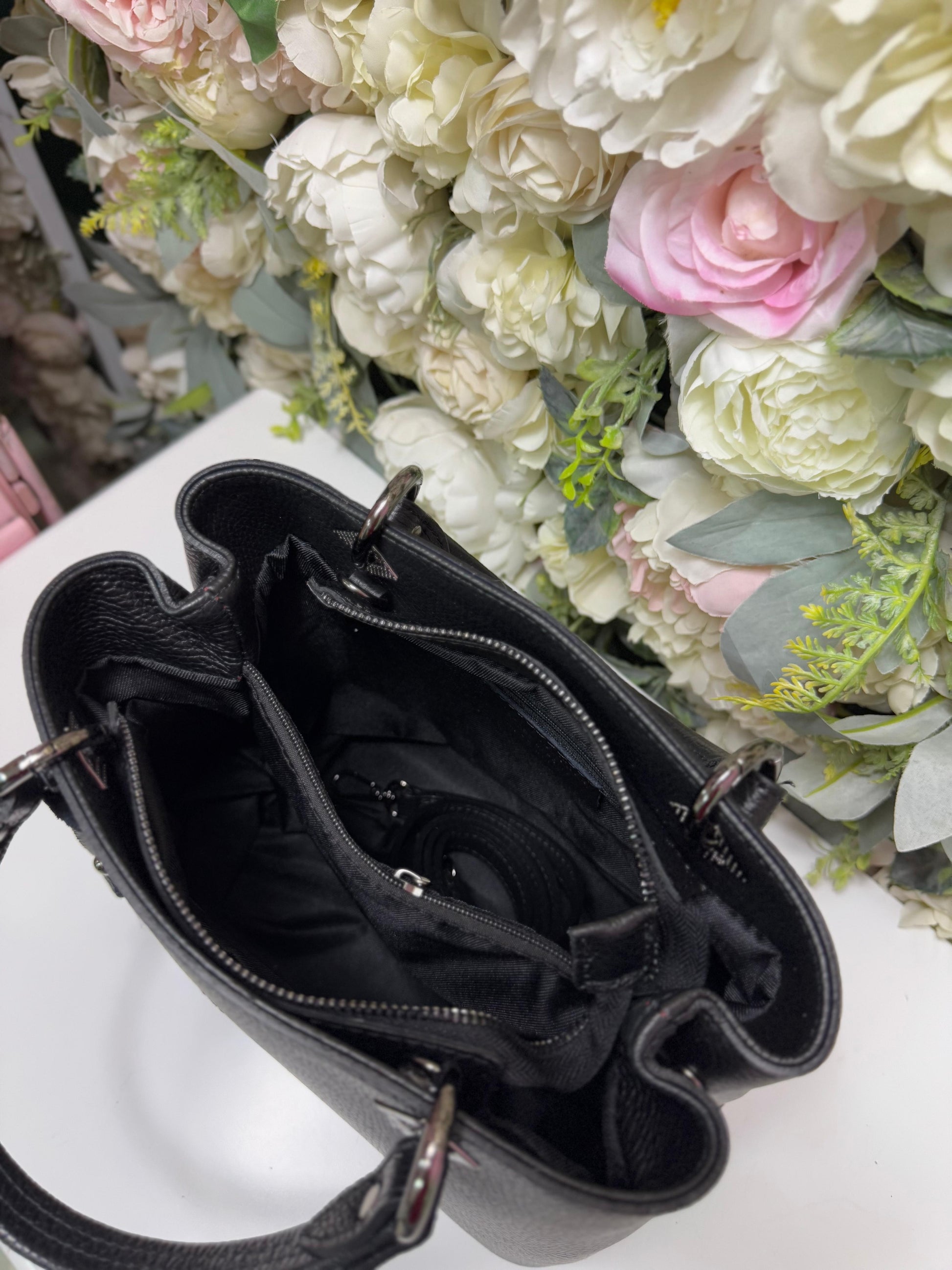 Geantă realizată din piele naturală dispune de două barete de mană si o baretă lungă, detasabilă, pentru confort sporit. Interiorul cuprinde două compartimente principale, un buzunar interior cu fermoar si incă unul discret pe spate.