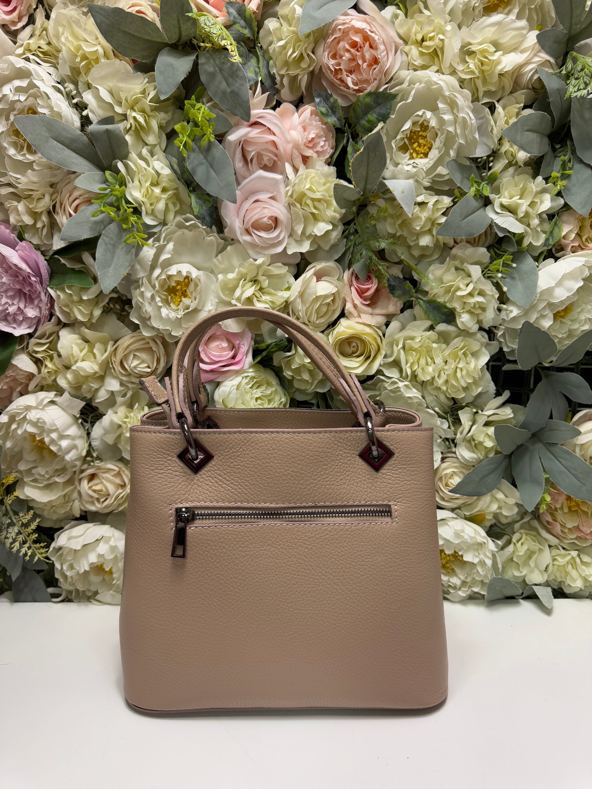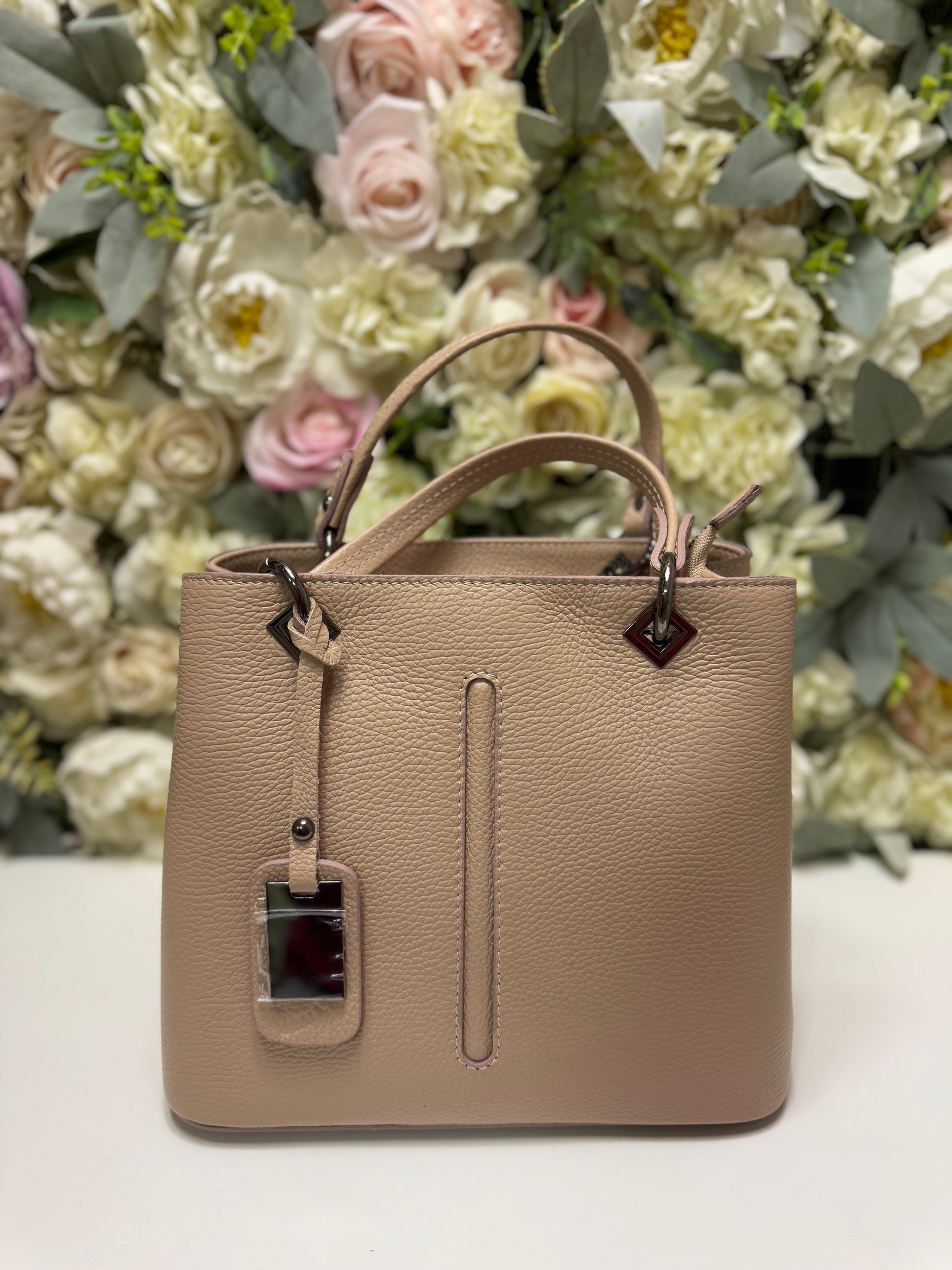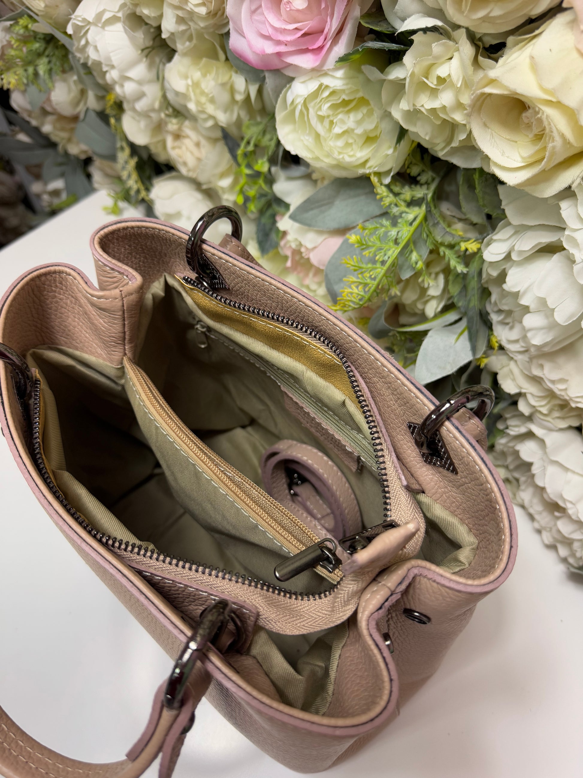 Geantă realizată din piele naturală dispune de două barete de mană si o baretă lungă, detasabilă, pentru confort sporit. Interiorul cuprinde două compartimente principale, un buzunar interior cu fermoar si incă unul discret pe spate.